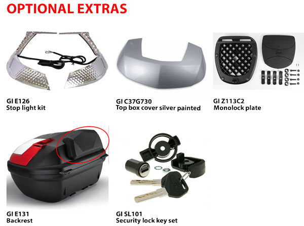 Givi B37NT Blade is a 37 lt case able to hold one helmet. Comes with smoked reflectors. Universal mounting plate included. Maximum loading of 3kg.