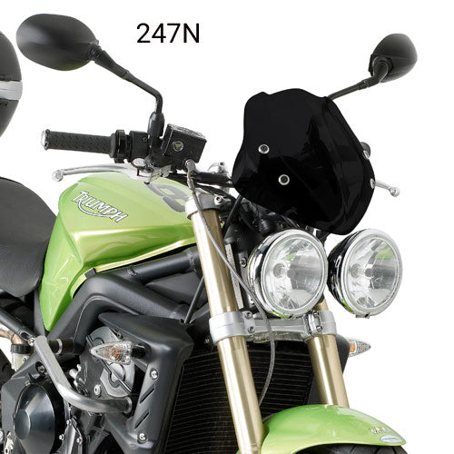 Universal screens for naked bikes, mounted via the headlight bracket.
