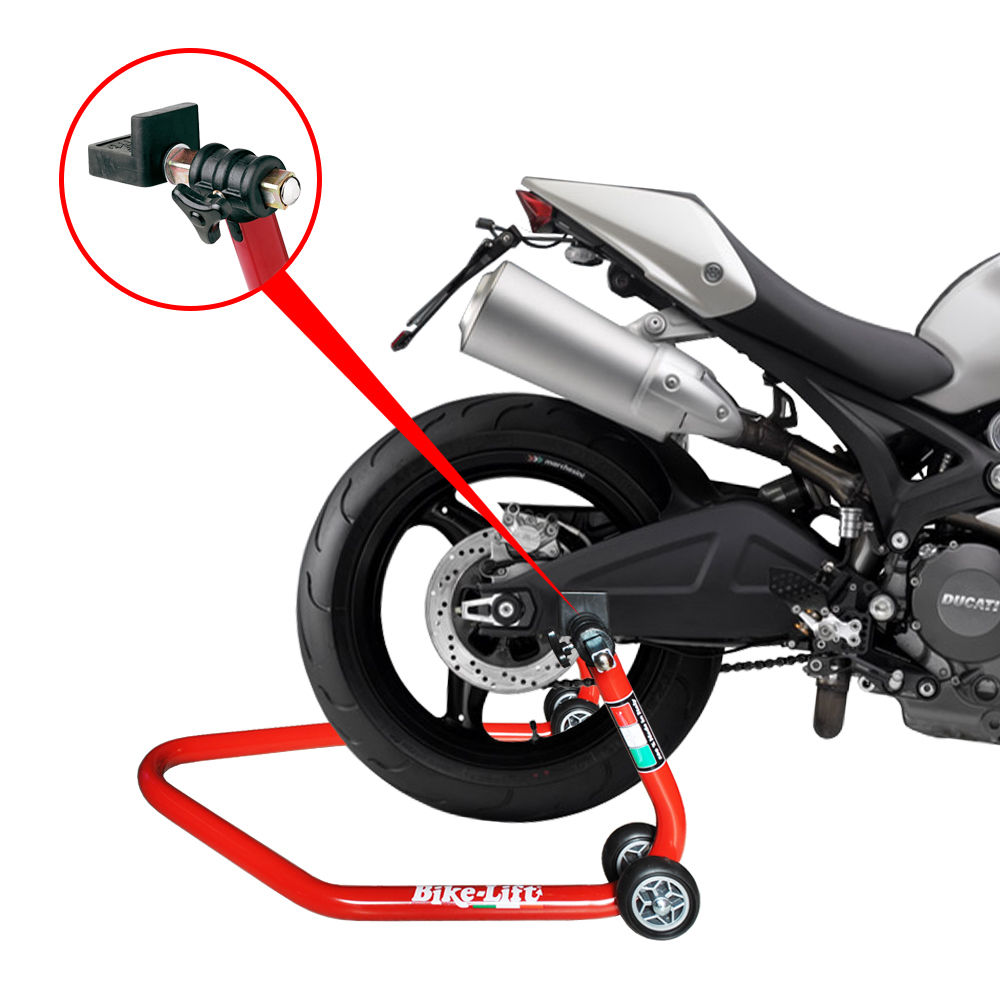 Universal rear stand designed with double wheels to insure maximum stability of the bike on the ground. Comes with either rubber cursers, V cursers, or both sets of cursers. 34cm high.
