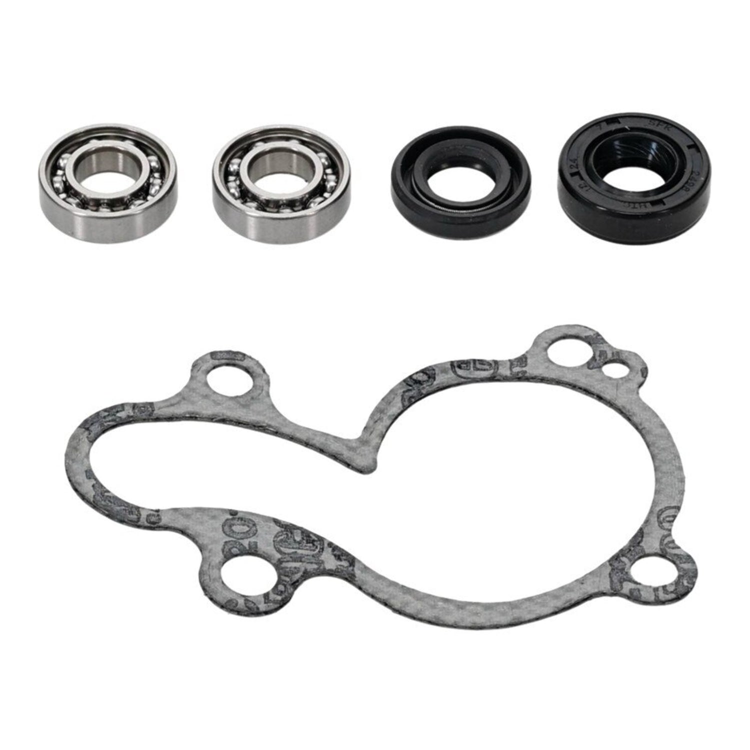 Kit includes water pump cover gasket or o-ring, water pump shaft bearing(s) and seal(s) to repair a leaking water pump seal and/or a failed bearing.