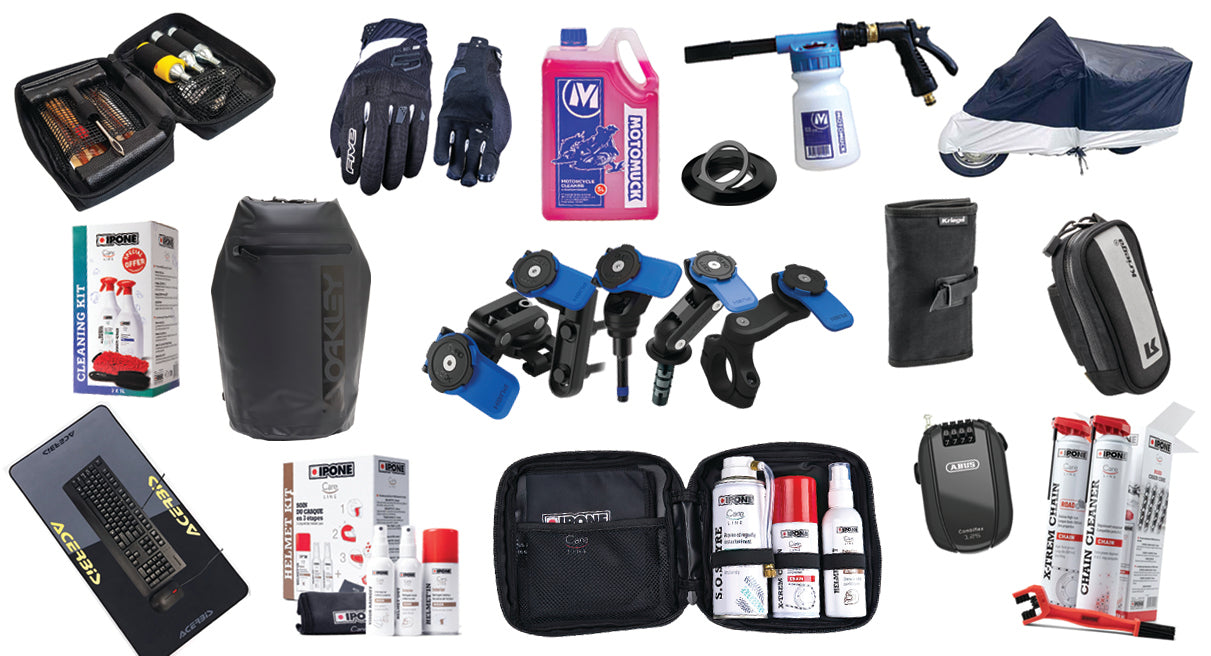 IPONE Road Trip Kit: Roadside rescue kit. 1x 100ml X-Trem Chain lube (road specific), 1x 200ml SOS Tyre Repair, 1x 100ml Helmet'Out Exterior Cleaner, & 1x microfiber cloth (D.G).